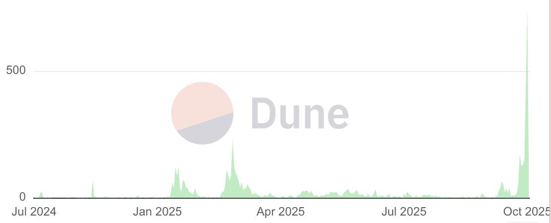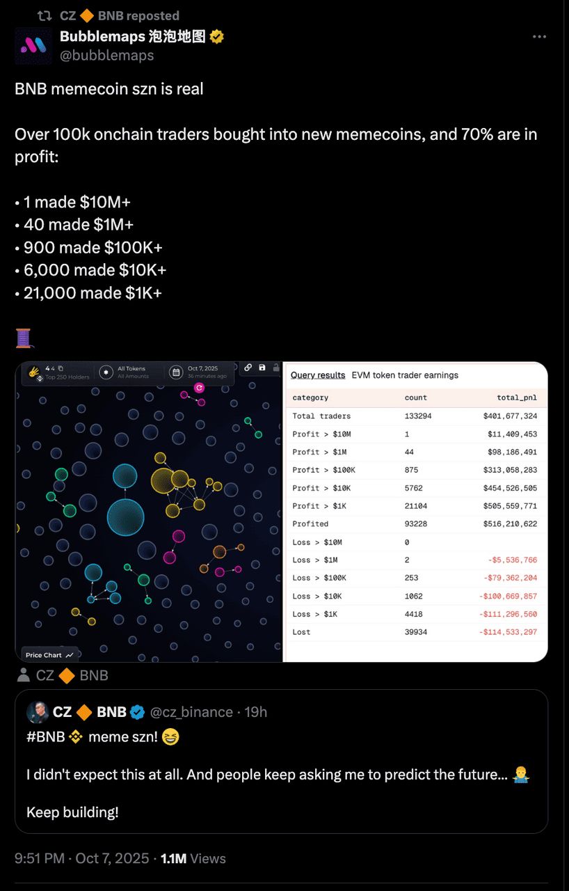 这次飙升始于 2025 年 10 月初,当时币安创始人赵长鹏(CZ)在 X 上发布了 「BNB meme szn」,在整个 BNB 生态系统中引发了一股病毒式的投机浪潮。来自 Bubblemaps 和 Holder 的链上数据显示,当周有超过 10 万名新交易者加入,其中约 70% 从基于 BNB 的迷因币中获利。这股热潮也将 BNB 推高至 1,300 美元以上,使其短暂成为市值第三大的加密货币,在情绪和价格动能之间创建了强大的反馈循环。