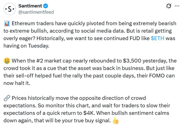 “以太坊交易者迅速从极度看跌转向极度看涨,”Santiment表示,并补充说当ETH”昨天几乎反弹至3500美元时,群众将其视为该资产重回正轨的信号。”